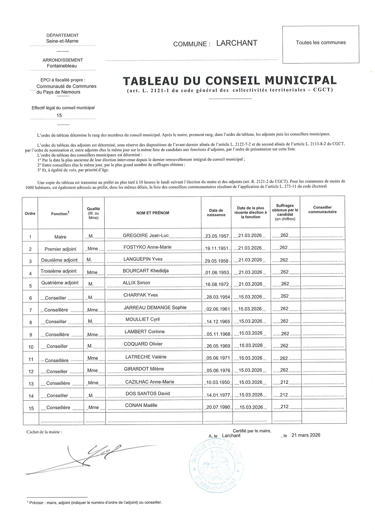 Composition du conseil municipal suite à la réunion du samedi 21 mars 2026.